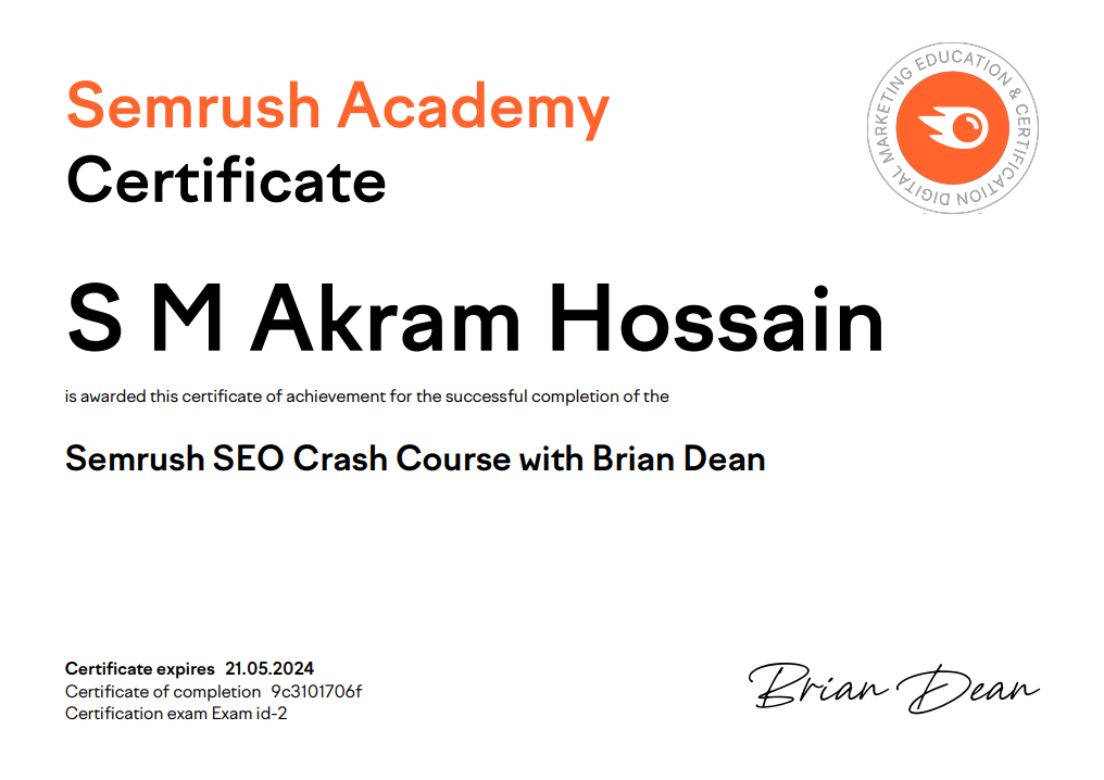 SEO Crash Courser Certificate by Semrush Brian Dean